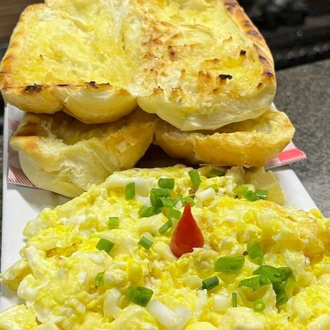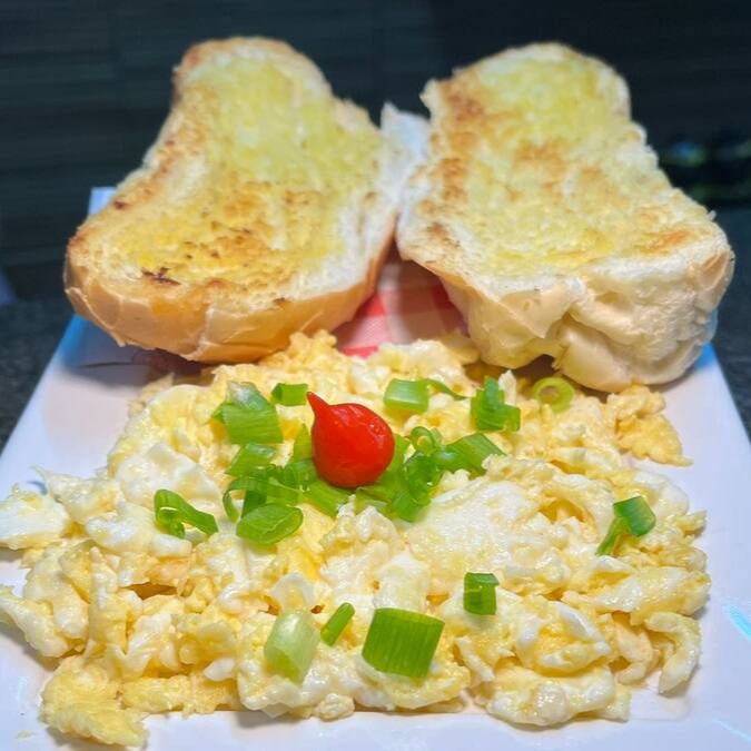 1 pão assado com ovos mexidos