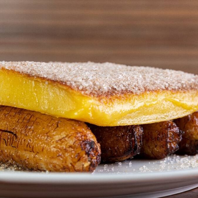 Banana caramelizada, queijo mussarela, leite condensado, açúcar e canela.