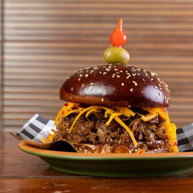 Pão brioche, carne de costela desfiada, queijo do reino e cebola caramelizada.