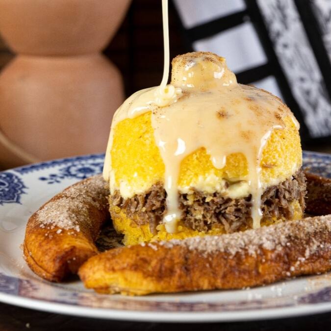 Carne de sol, queijo coalho, banana com leite condensado e canela.