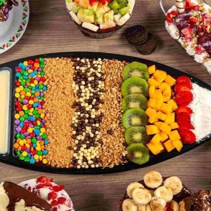 leite em pó, granola, fruta, bolinha de cereal,M&M(disquete), jujuba ,leite condensado e calda