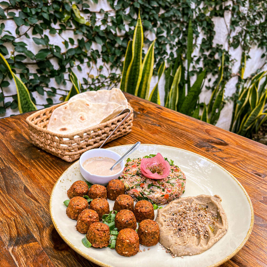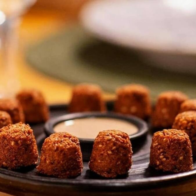 Bolinhos de grão de bico e muitos temperos saborosos com seu inseparável molho tahine.