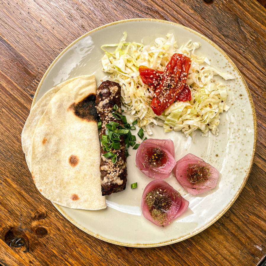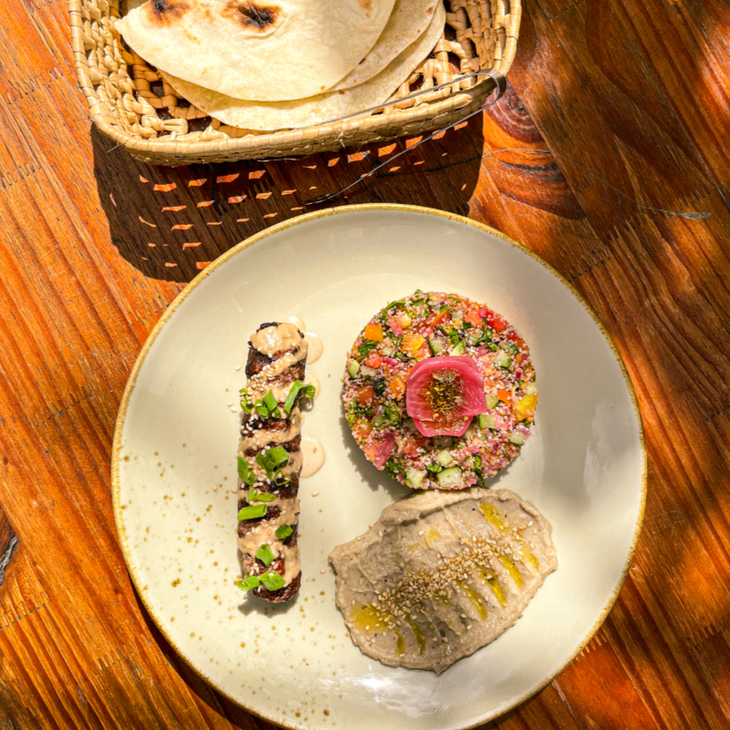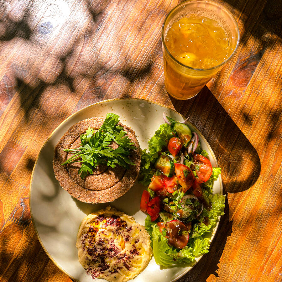 Kibe amanteigado e fofinho de carne bovina. Acompanha salada e pasta de sua escolha: hommus, labanie ou babaganoush.