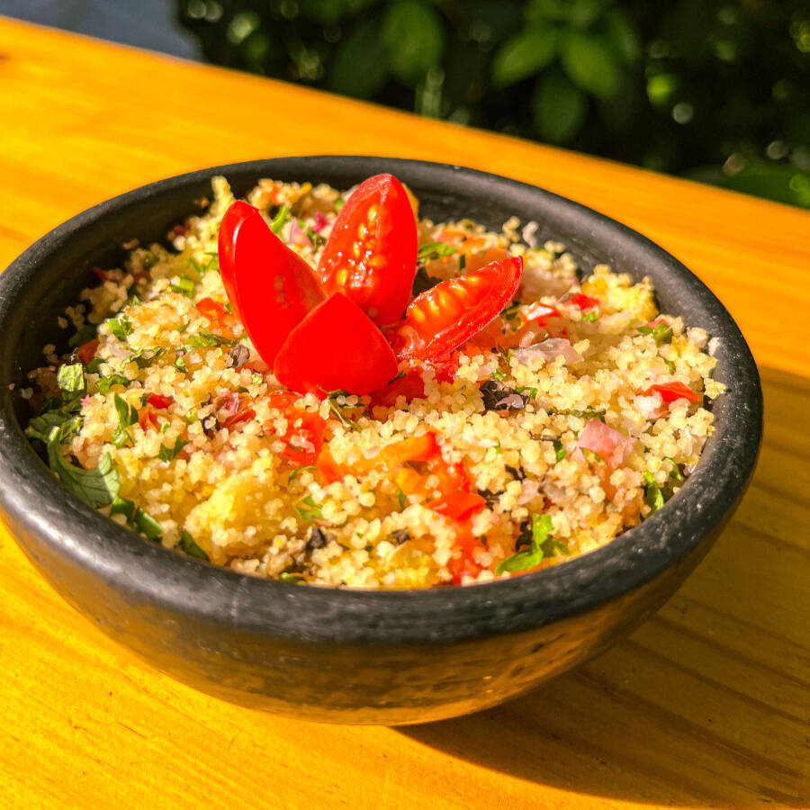 Saladinha clássica e refrescante de triguilho, tomate, pepino, cebola, alface, salsa e hortelã.