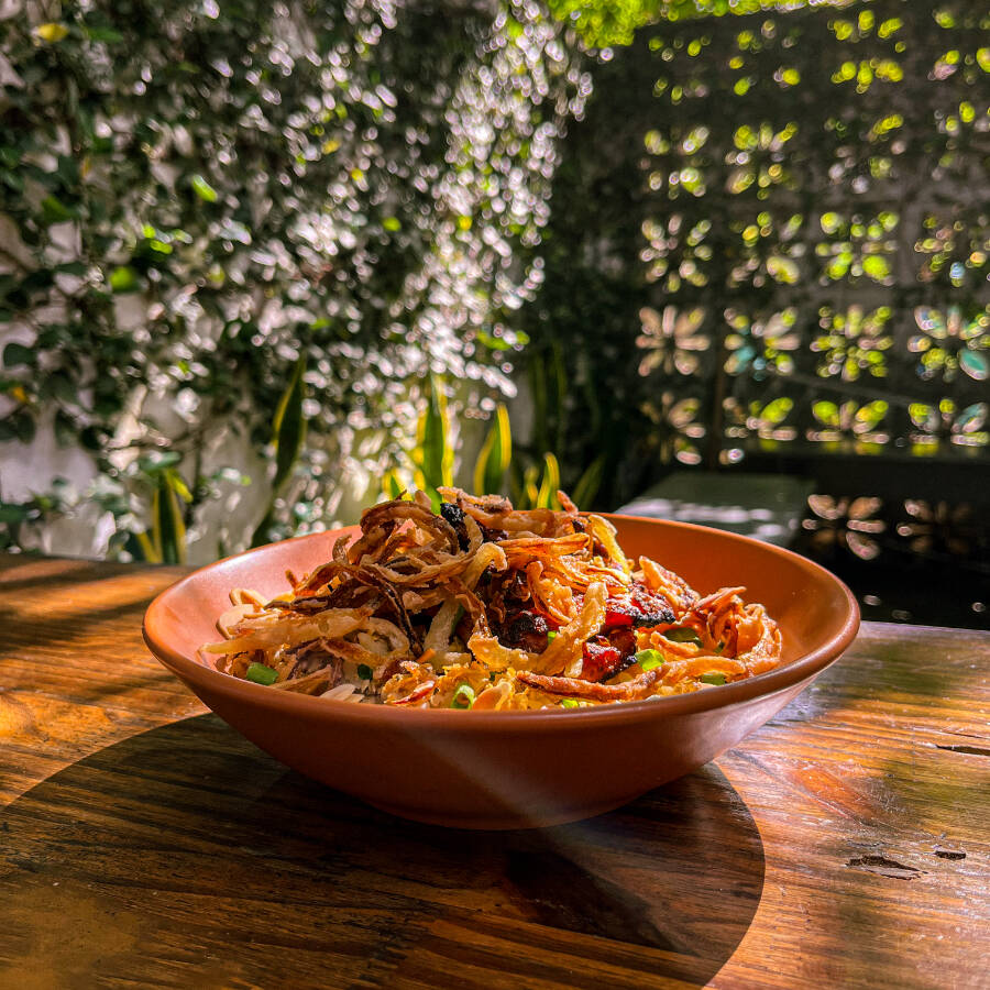 Labanie temperada com passa de caju e castanha de caju brejeira finalizada com zaatar e melaço de romã. Acompanha porção de manakish.