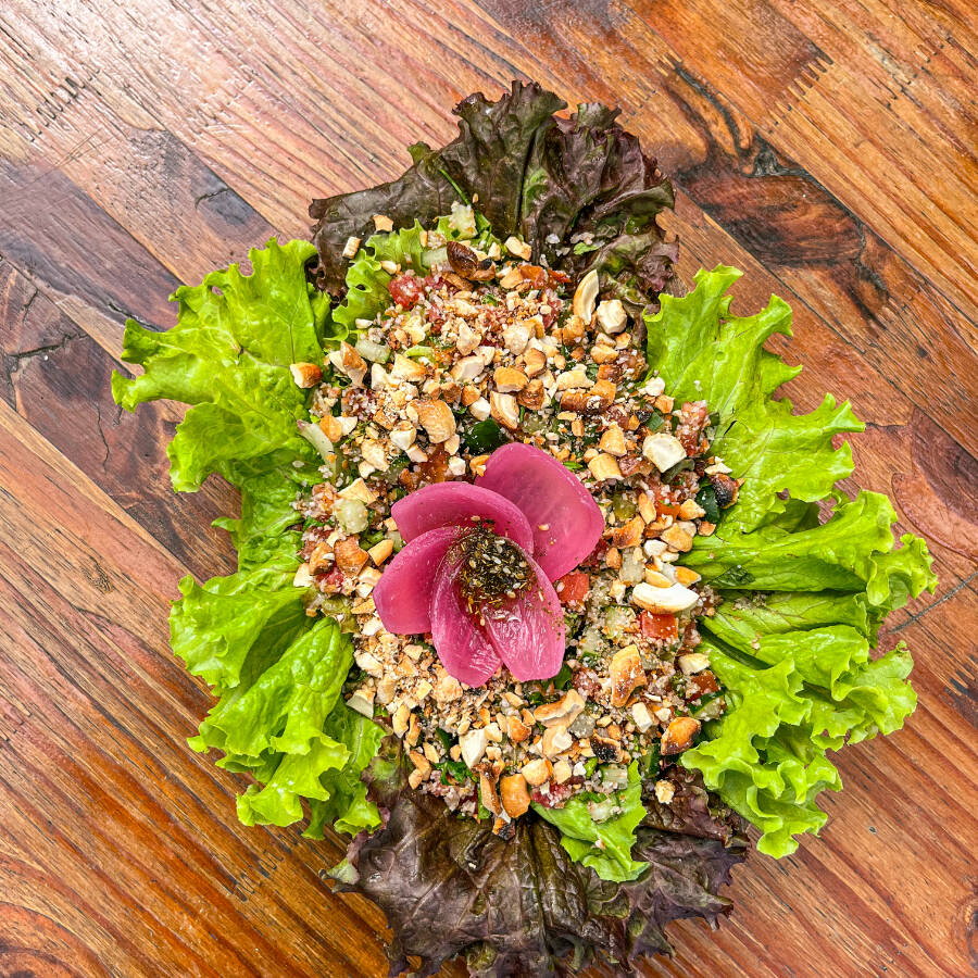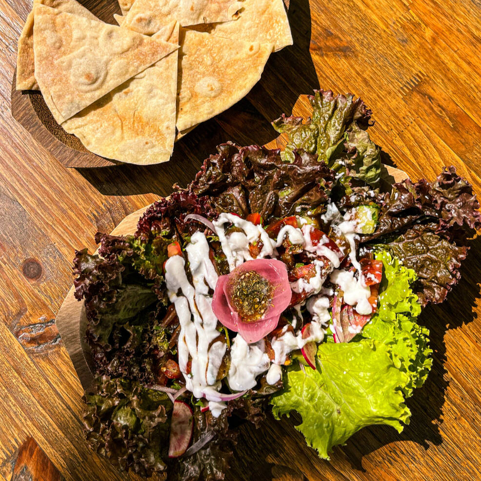 Salada de alface, pepino, tomate, rabanete, cebola roxa, hortelã, salsa, azeite de oliva, molho de iogurte, melado de tamarindo e pão folha torrado.