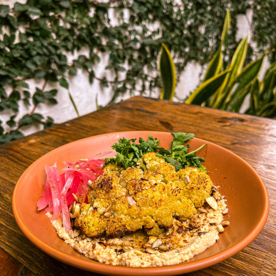 Couve flor grelhada com dukkah sobre base de hommus com picles de cebola roxa e coentro.