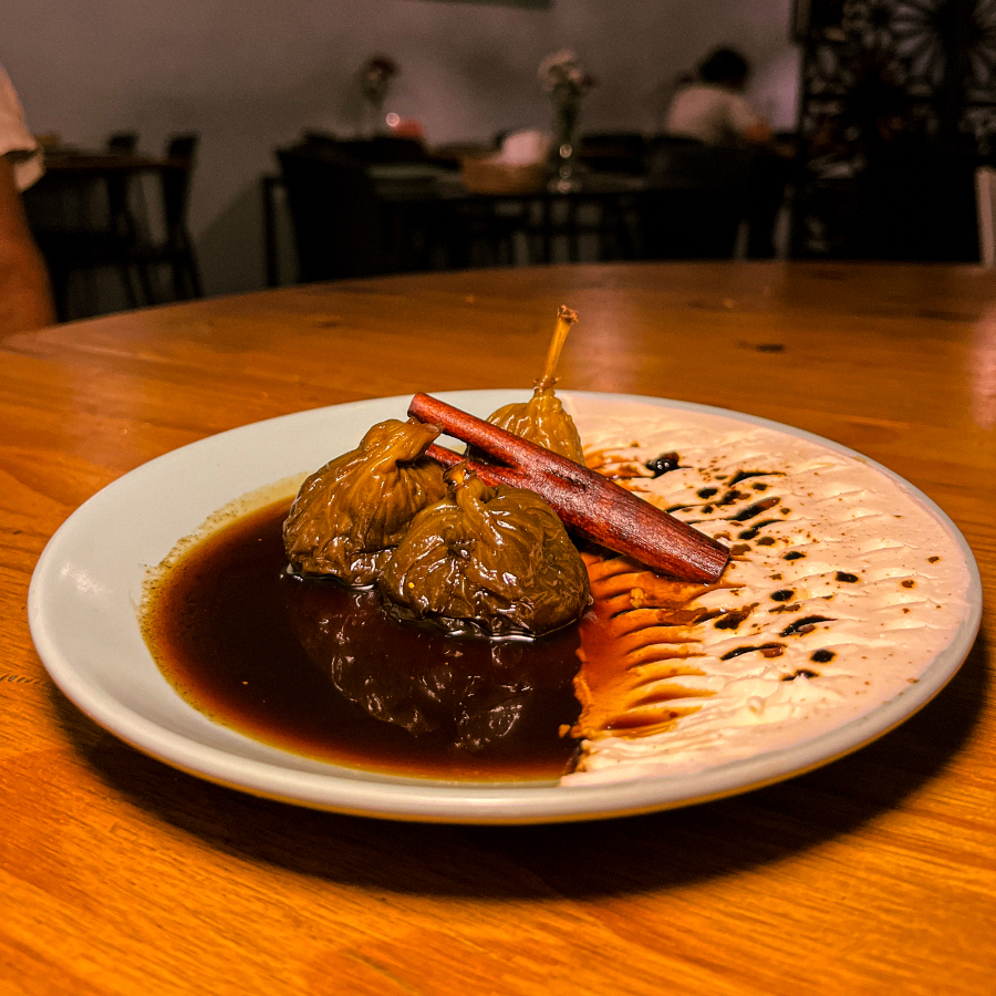Releitura de Figo Rami. Figo cozido com calda de café, canela e açúcar. Servida com coalhada.