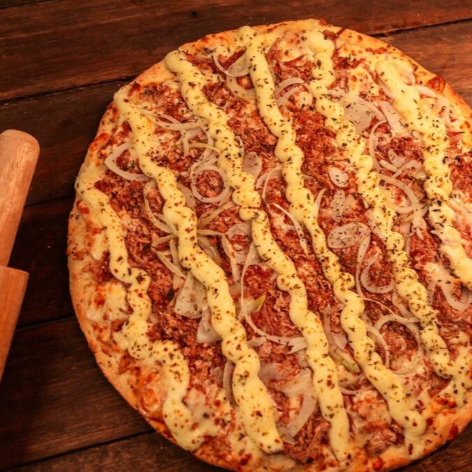 Molho de tomate, queijo muçarela, calabresa ralada, ovo, pimentão, tomate, cebola e finalizada com orégano.