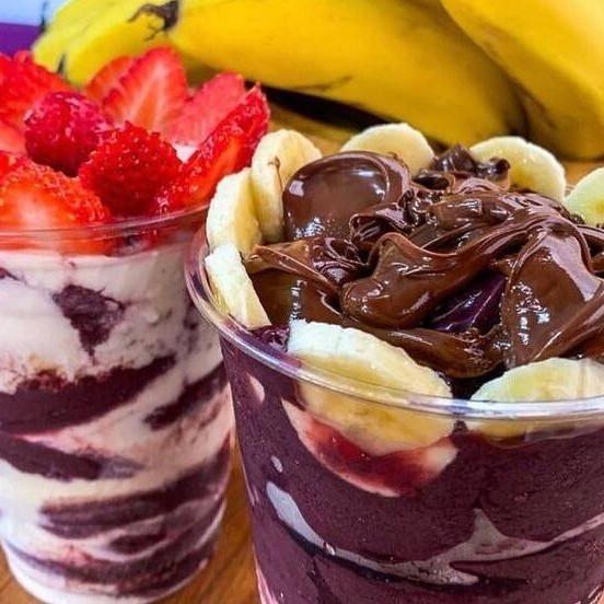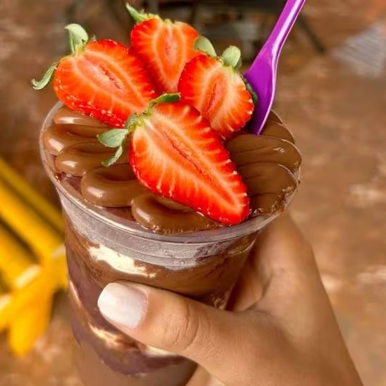 Açaí super cremoso com camadas de creme de avelã e morangos fatiados. Uma combinação perfeita entre o intenso sabor do chocolate e o frescor da fruta. Doce na medida e irresistível em cada colherada!