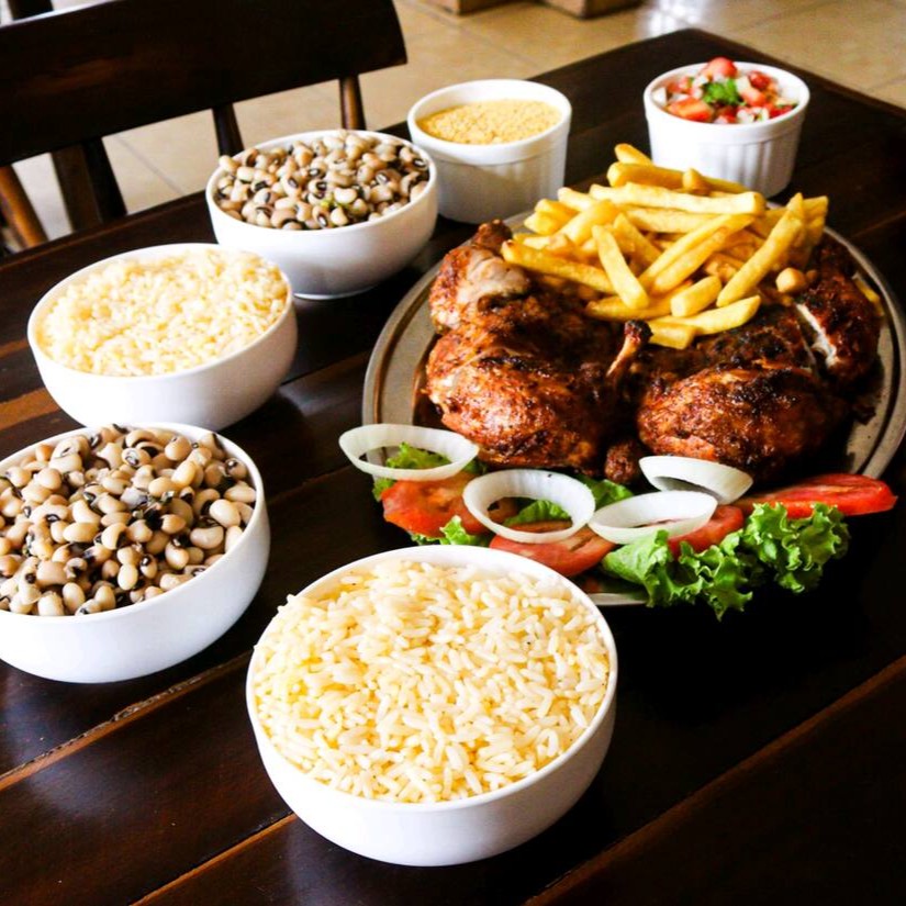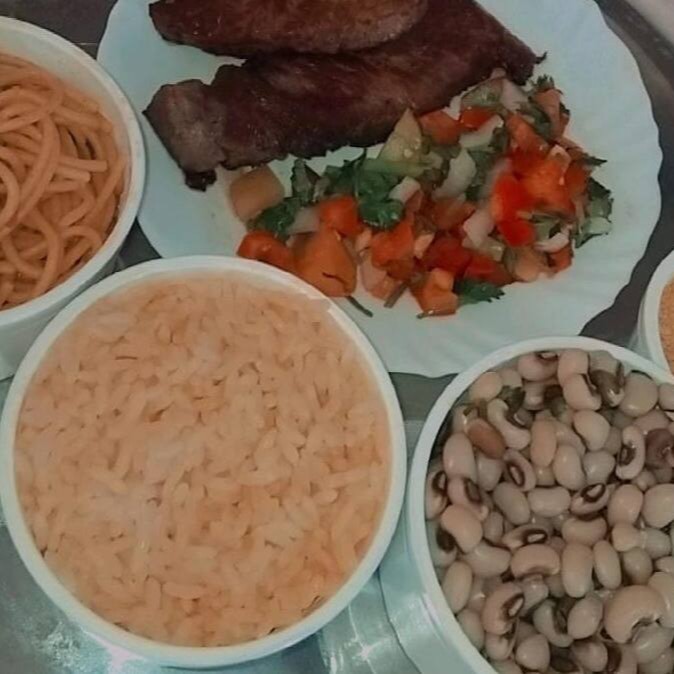 Arroz, macarrão, feijão (colocar na opção se deseja macassa, mulato ou preto) , farofa e vinagrete.