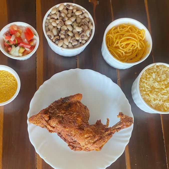 Feijão macassar, arroz branco, farofa, vinagrete e batata frita.