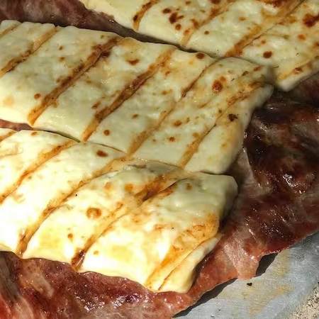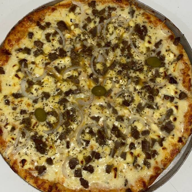 Massa artesanal coberta com molho de tomate, recheada com queijo mussarela, carhe de sol, cebola e finalizada com orégano e azeitona.