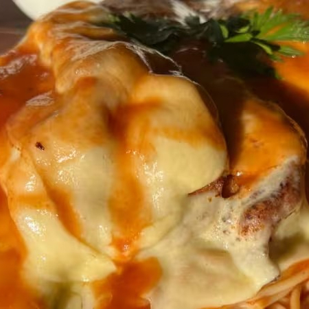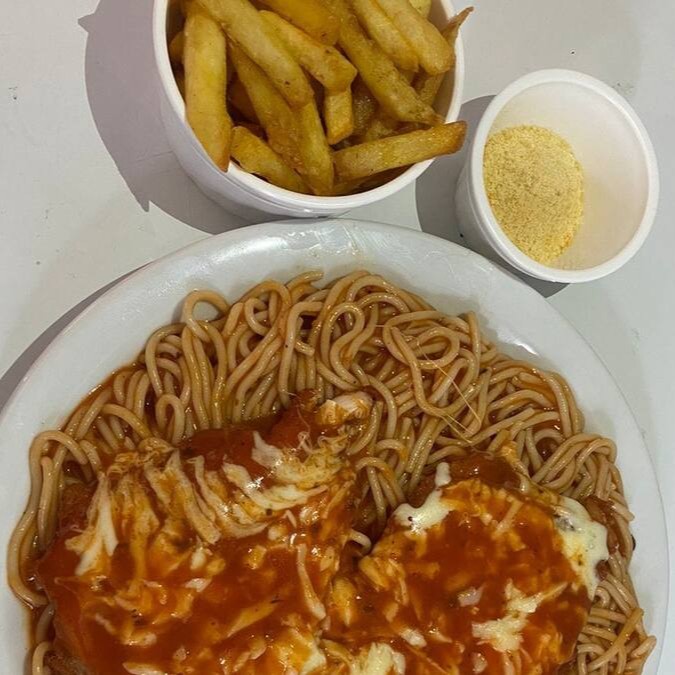 Spaghetti ao molho de tomate, frango à milanesa coberto com queijo mussarela e batata frita.