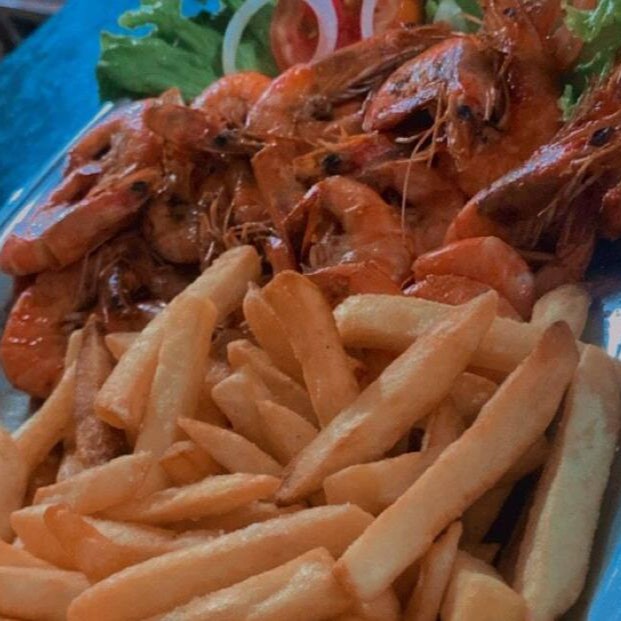 Camarão ao alho e óleo com crocantes batatas fritas.