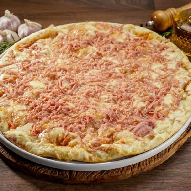 Massa artesanal coberta com molho de tomate, mussarela, presunto e finalizada com orégano e azeitona.