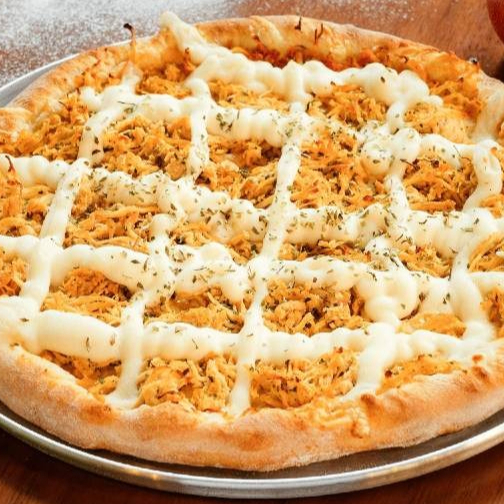 Massa artesanal, coberta com molho de tomate, recheada com queijo mussarela, frango desfiado, e finalizada com orégano e azeitona.