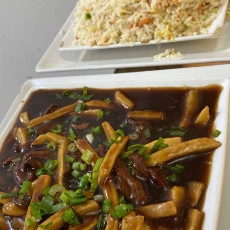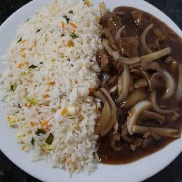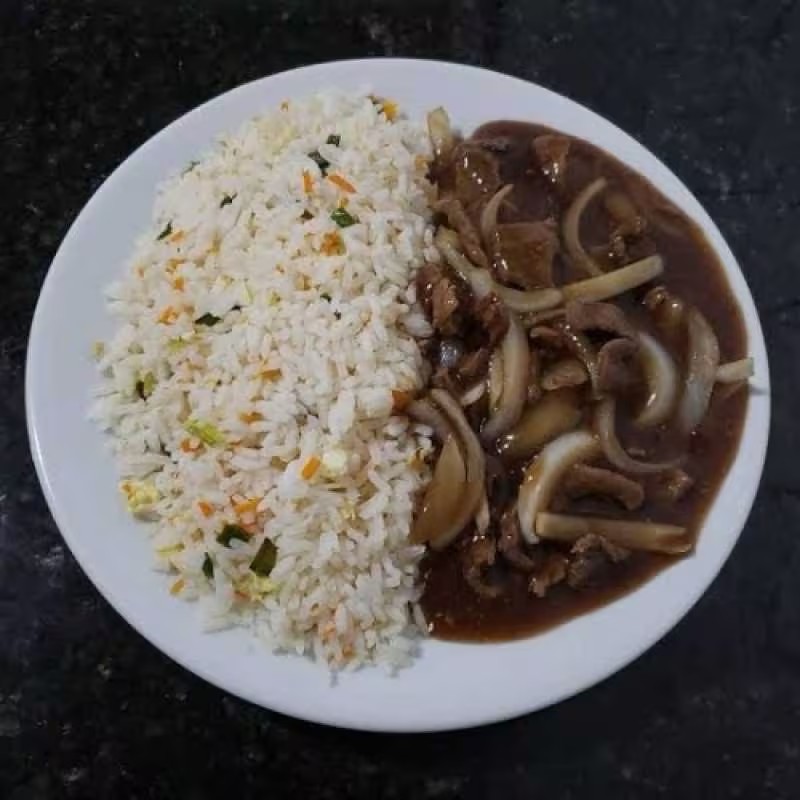 Arroz shop-suey, carne, cebola (opcional) ao molho shoyu