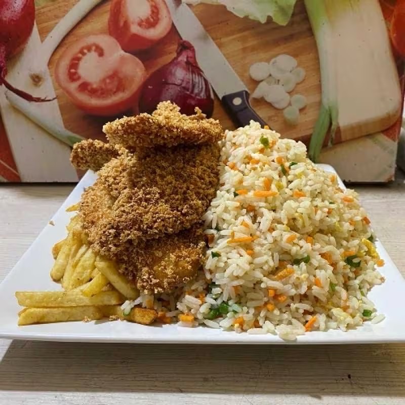 Arroz shop-suey, batata frita, pedaços de coxa de frango