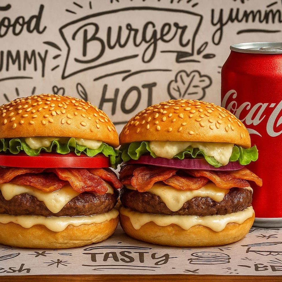 Chef Burger Bacon + Coca-cola 350ml – O Sabor que Define um Verdadeiro Burger Gourmet Hambúrguer artesanal 140g com blend selecionado e tempero especial do chef, trazendo um toque defumado irresistível. Receita completa com molho especial de alho com bacon, bacon crocante e queijo mussarela derretido + 01 coca-cola lata 350 ml. Um clássico gourmet criado para entregar suculência, equilíbrio e sabor nível Masterchef.