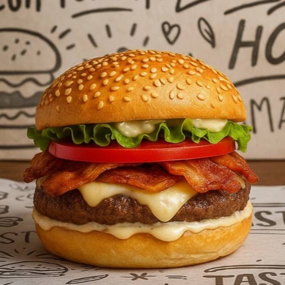 Chef Burger Bacon– O Sabor que Define um Verdadeiro Burger Gourmet Hambúrguer artesanal 140g com blend selecionado e tempero especial do chef, trazendo um toque defumado irresistível. Receita completa com molho especial de alho com bacon, bacon crocante, queijo mussarela derretido, picles crocante e salada fresca. Um clássico gourmet criado para entregar suculência, equilíbrio e sabor nível Masterchef.