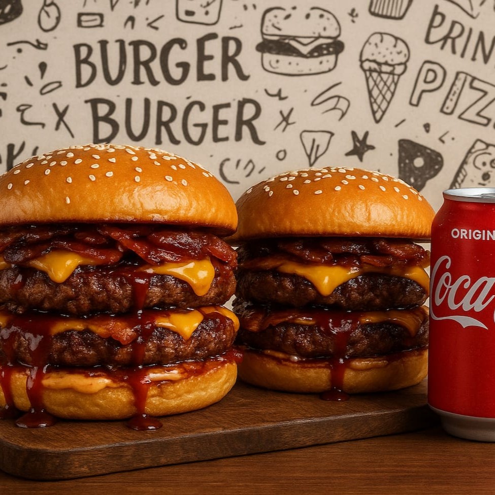 Combo Bg5 - 02 Chef Duplo Barbecue Supremo + 01 Coca-Cola 350 ml O Chef Barbecue Supreme reúne tudo o que um verdadeiro apaixonado por sabor busca. Dois discos de carne artesanal 140g (TOTAL 280g de CARNE) com toque defumado, queijo mussarela defumado derretido, bacon crocante, calabresa e uma camada generosa do nosso molho barbecue artesanal. Finalizado com a exclusiva maionese especial de alho com bacon no pão brioche com gergelim. Um burger robusto, intenso e irresistível — assinatura Sabores do Chef.