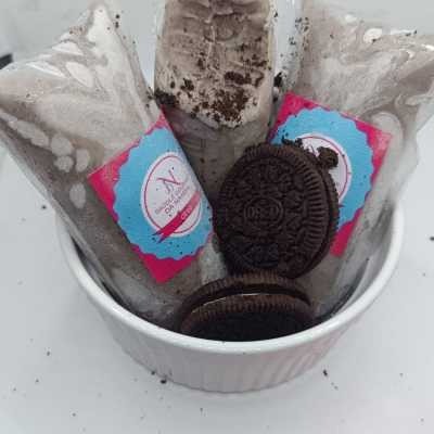 Sacolé cremoso com pedaços de Oreo, perfeito para quem ama biscoito.