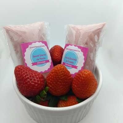 Sacolé cremoso de morango com fruta natural, doce na medida certa e muito refrescante.