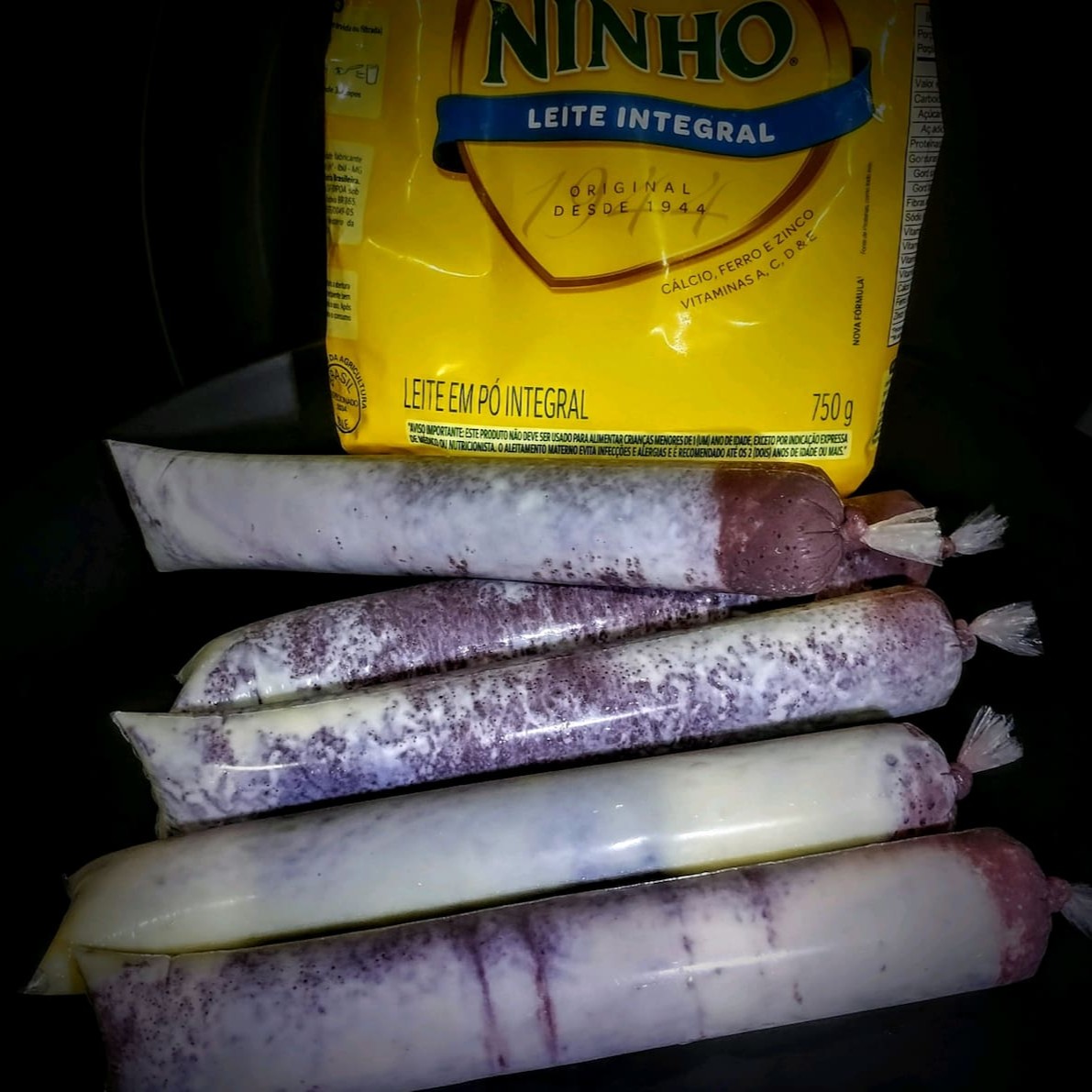 Um Delicioso sacolé sabor Açaí com leite condensado, Ninho e banana. Um dos nossos queridinhos.