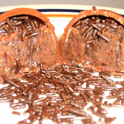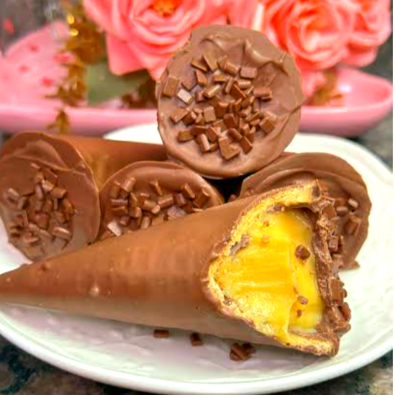 Casquinha de sorvete coberta com chocolate 50 % meio amargo e recheada com brigadeiro branco de Ninho e pedaço de amendoim, uma delícia vem sentir essa experiência gostosa.