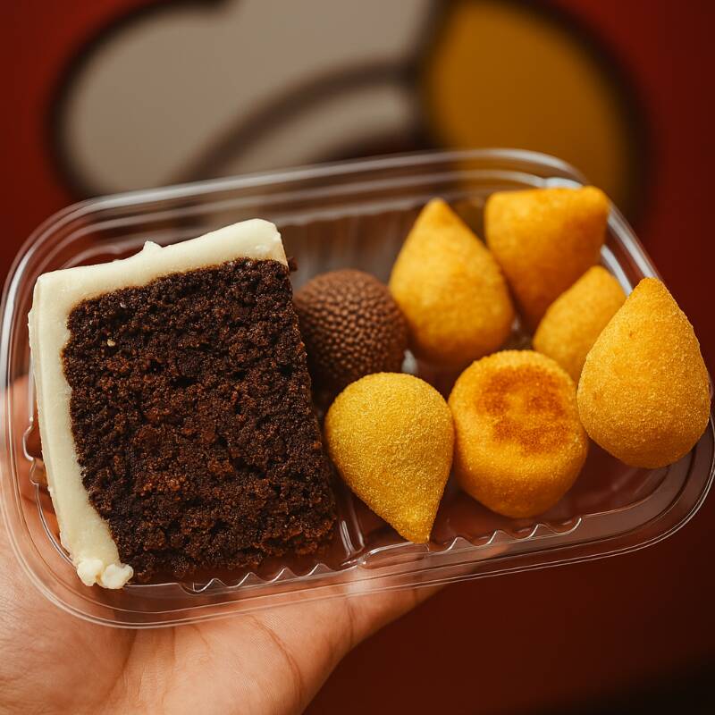 Delicie-se com nosso irresistível kitinho festa: fatia de bolo de prestígio e deliciosos salgadinhos fritos, perfeitos para qualquer momento.
