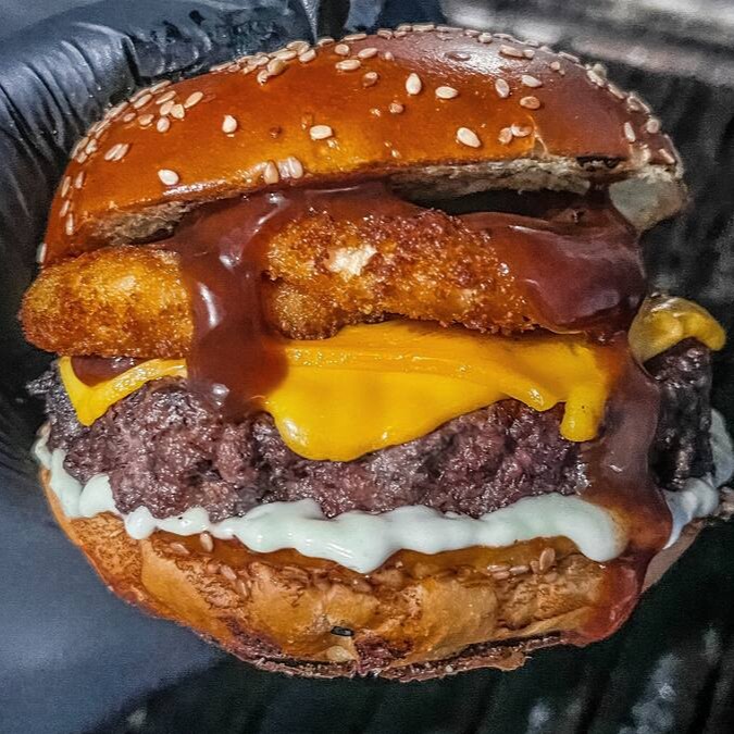 Delicioso sanduiche artesanal, acompanha :Pão de Brioche Burger Artesanal de 130g2 Fatias de Queijo CheddarCebola EmpanadaMolho Barbecue Maionese.
