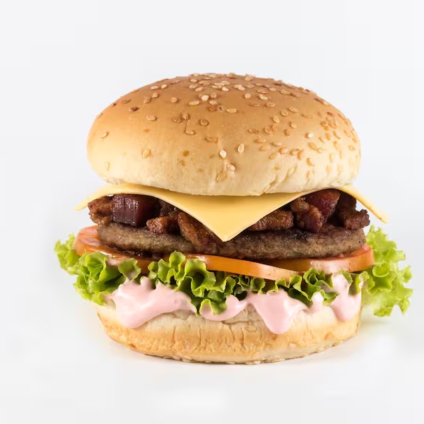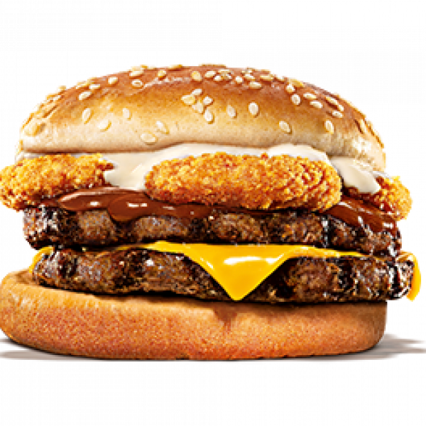 Caprichado Sanduiche Clássico ,composto de:Pão com gergelim, 2 Hambúrguers Bovino - Não ArtesanalQueijoAnel de cebola fritaMaionese Molho Barbecue