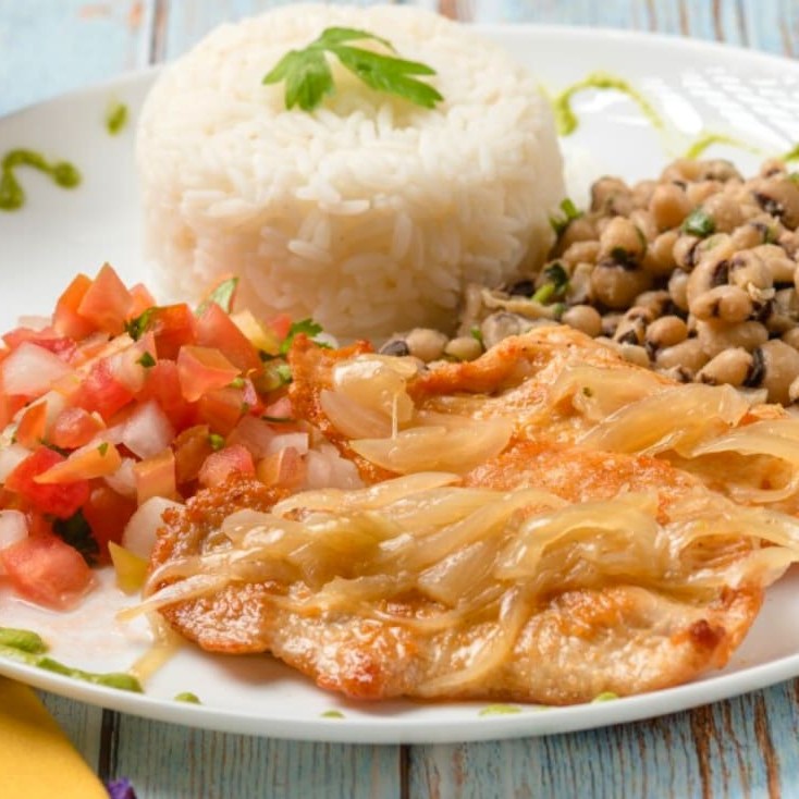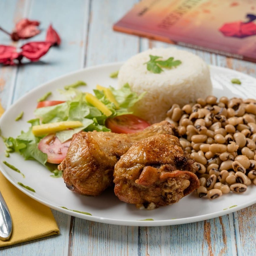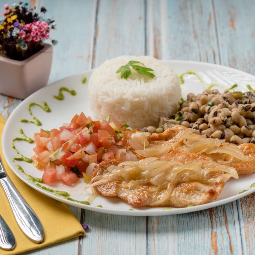 Porção generosa de filé de frango acebolado,acompanhado feijao macassar, arroz branco e salada crua