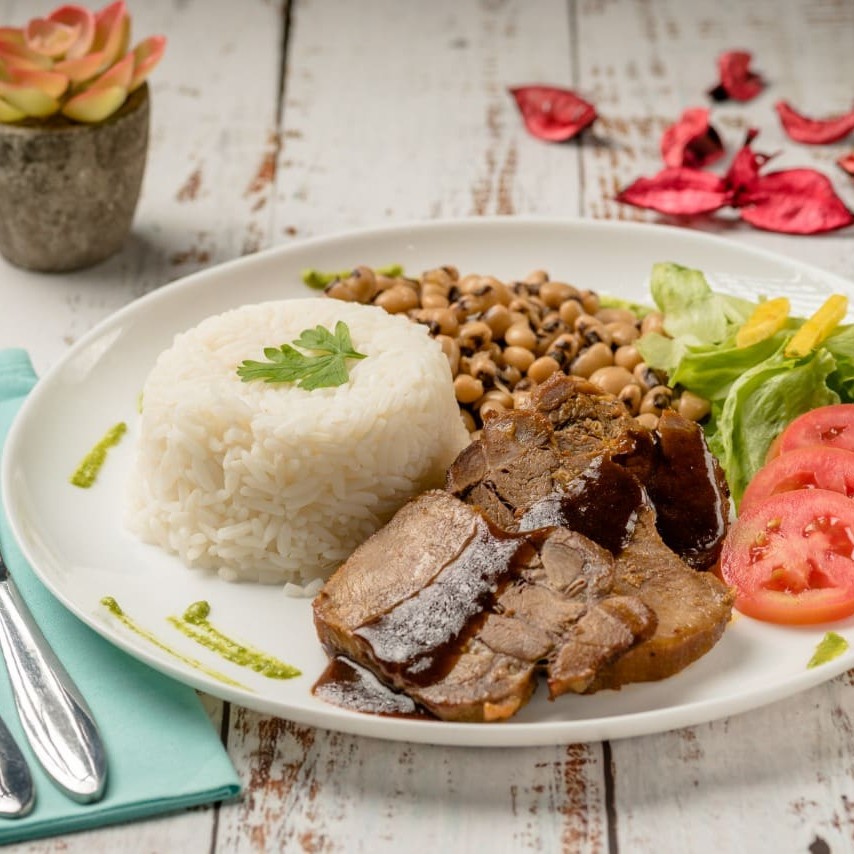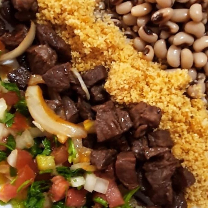 Deliciosa carne de sol picadinha na cebola acompanha feijão macassar, arroz branco, vinagrete e farofa.