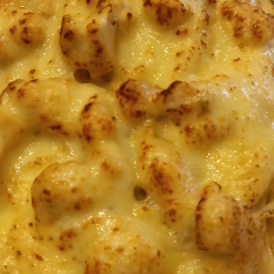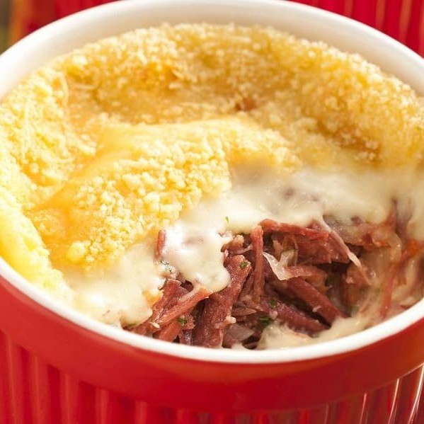 Delicioso pure de macaxeira e cubinhos de queijos e de carne de sol acebolada, gratinado com queijo mussarela acompanha arroz branco