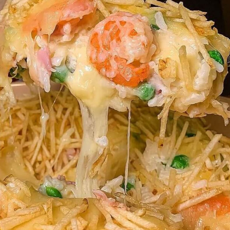 Servido no cremoso arroz com ervilhas e queijo, presunto envolvido com o molho branco feito com vinho branco (provolone,parmesão e Catupiry), gratinado com queijo mussarela! Acompanha batata palha. A Preparacao Desse Prato E Realizado No Ato Do Pedido E Precisa De Forno. Gentileza Considerar 40min De Preparação