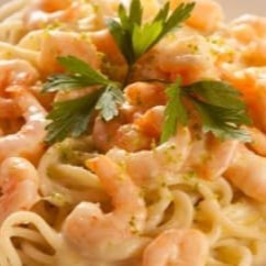 Deliciosa massa de spaghetti ao molho caseiro de 4 queijos (parmesão, gorgonzola, Catupiry e provolone) acompanhado de camarão no azeite.