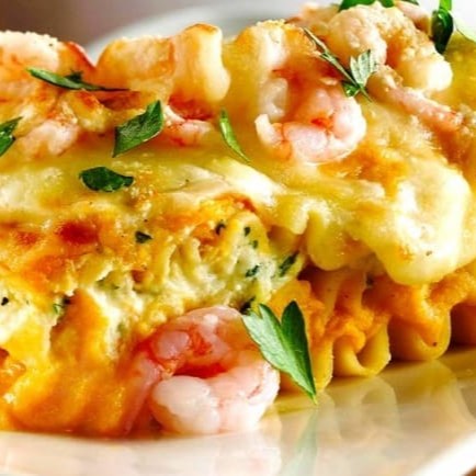 Deliciosa massa recheada com queijo mussarela, molho misto tomate/branco e camarões de 10grs. Porção individual aprox 500grs