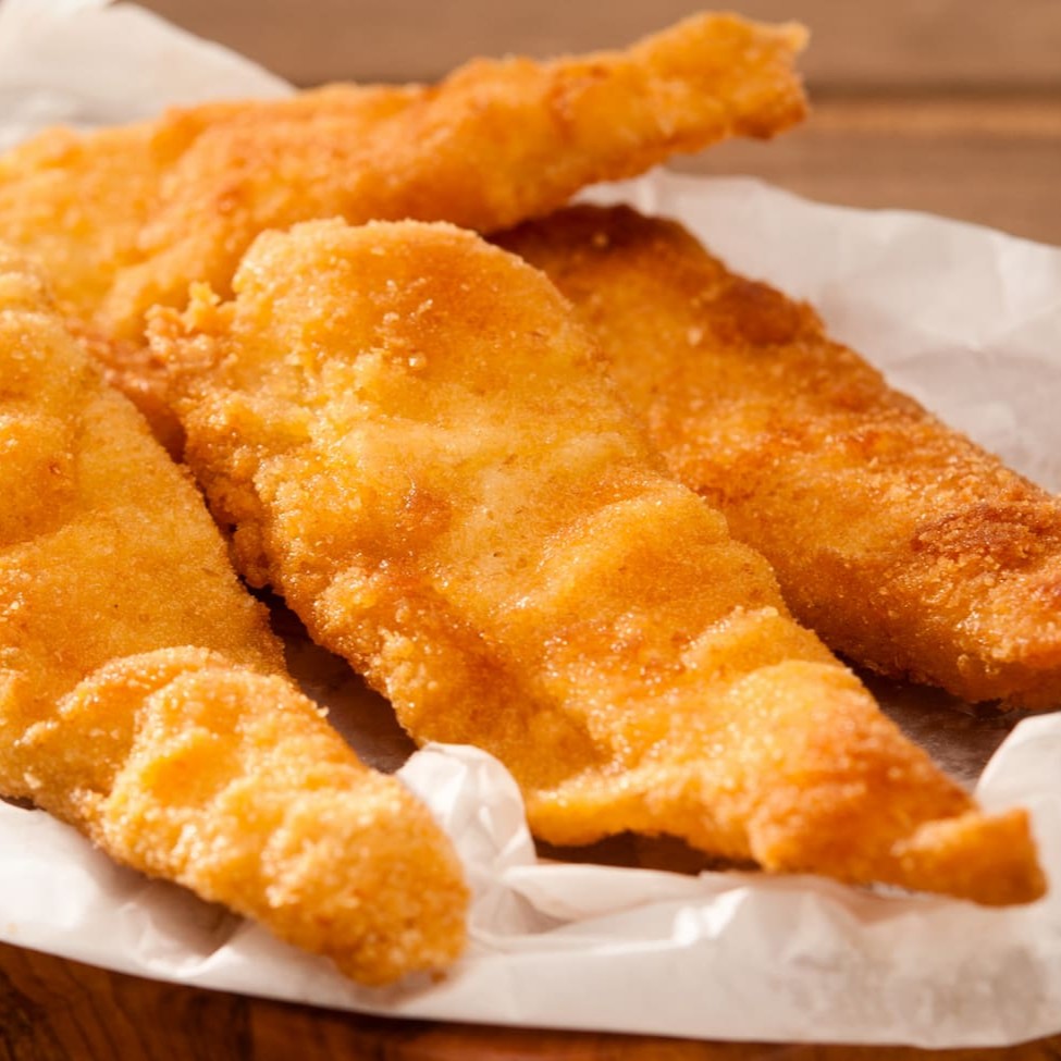 Saboroso filé de peixe empanado acompanhado de arroz branco, feijão macassar e salada crua