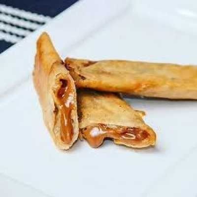 Delicioso rolinho crocante recheado com doce de leite cremoso, uma explosão de sabor em cada mordida.
