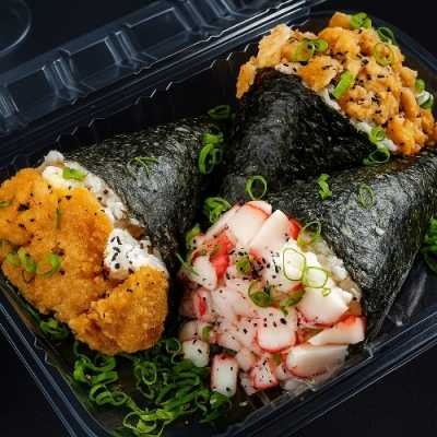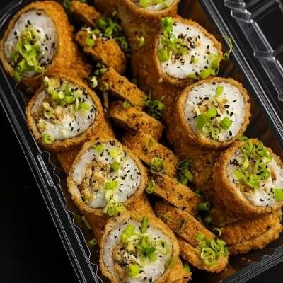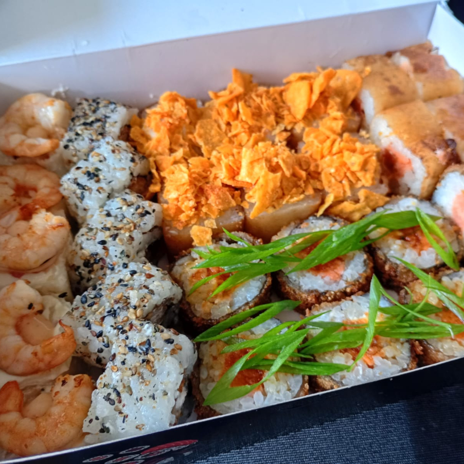 5 Kani keijo finalizado com Maionese Spacy e camarão 5 uramaki de camarão 12 Hot harumaki finalizado com do cream chesse e Doritos 12 carioca de salmão finalizado tare e Cebolinha