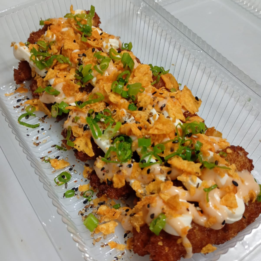 Tempura De Camarão 10 Unidades - Camarão Crocante Com Cobertura De Cream Cheese E Maionese Spacy, Finalizado Com Doritos, Cebolinha E Gergelim.