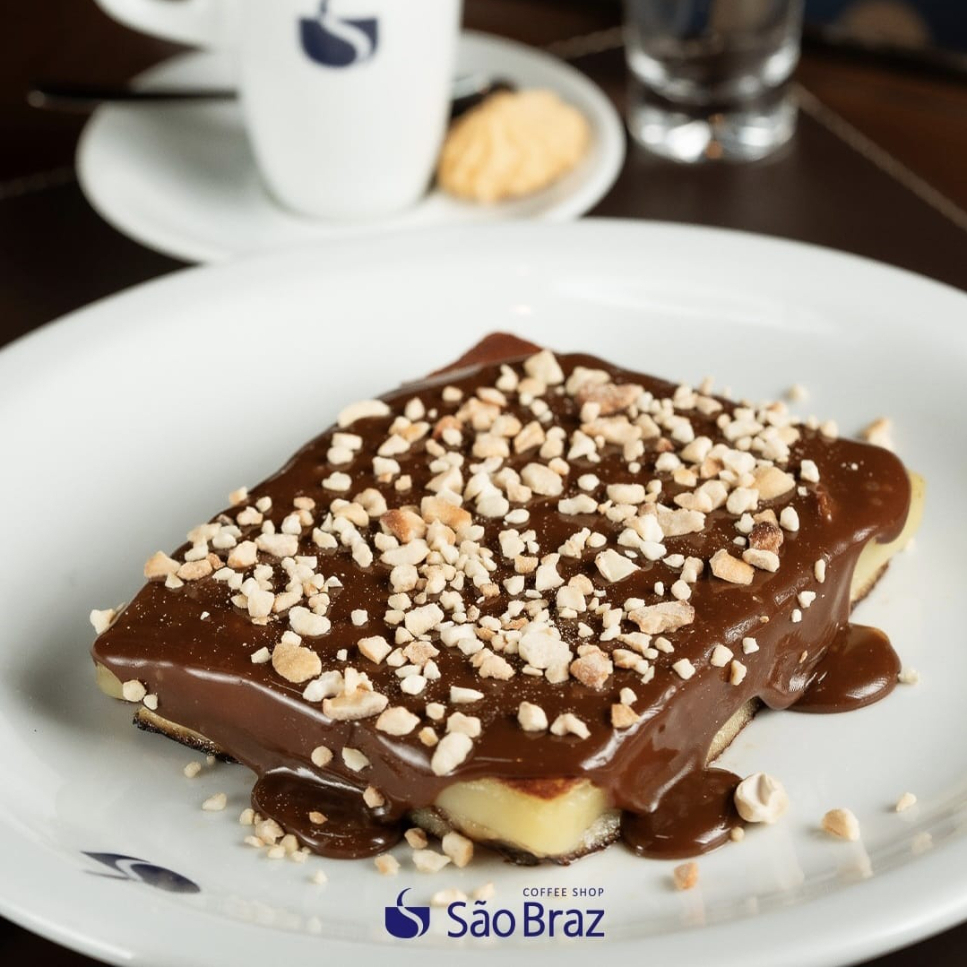 Banana, queijo manteiga, cobertura de chocolate, xerém de castanha, mel de engenho e manteiga.
