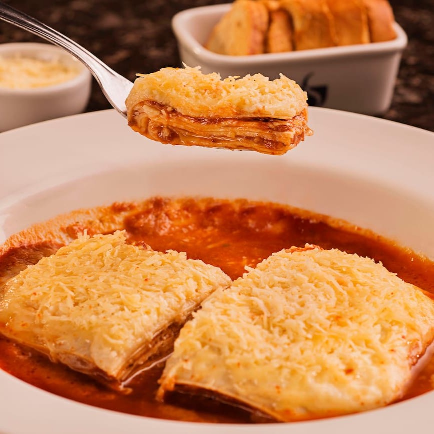 Camadas de massa fresca envolvidas por um molho bolonhesa cozido lentamente, finalizada com gratinado dourado que entrega sabor intenso.