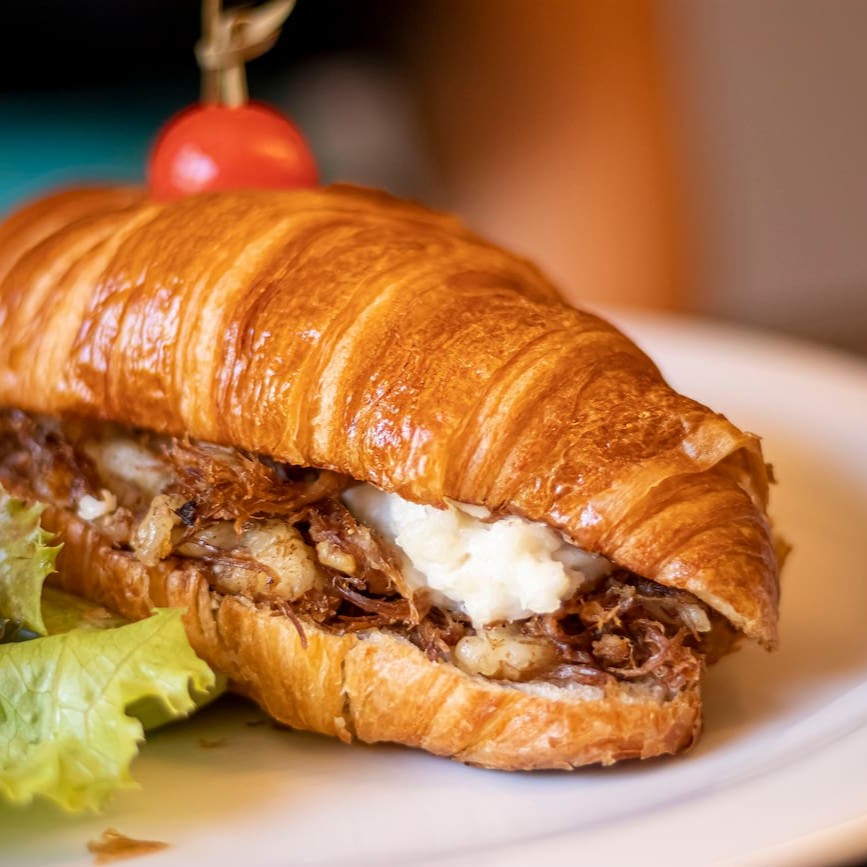 Croissant recheado com creme de avelã, finalizado com açúcar e amêndoas, unindo crocância e doçura.