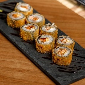 Arroz recheado com cream cheese e camarão, envolto por alga nori, empanado na farinha panko e frito.