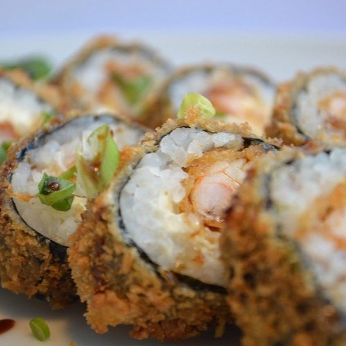 Koni de arroz, recheado com cream cheese a proteína da sua escolha, envolto por massa harumaki (a mesma do rolinho) e frito.