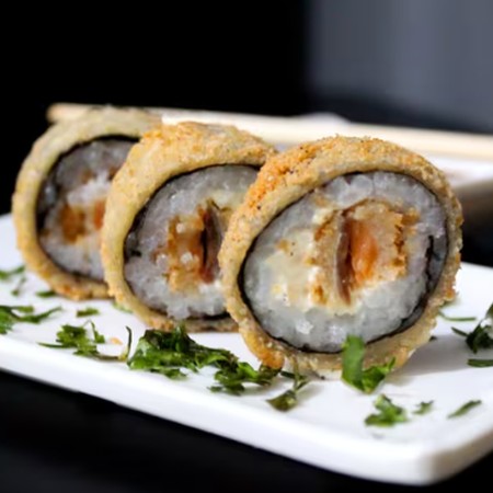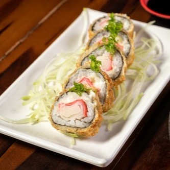 Arroz recheado com cream cheese e kani, envolto por alga nori, empanado na farinha panko e frito.