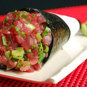 Cone de arroz, cream cheese e cubos de atum, envolto por alga nori e finalizado com gergelim.